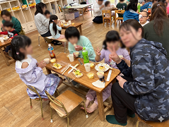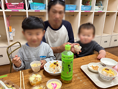 食育カフェFUTABA① 今日は保護者会のワークショップに合わせて食育カフェを開催しました。食育カフェは親子で保育園の給食を楽しんでいただく取り組みで、昨年も好評をいただいたので、今年も月1回ぐらいのペースで開催できればと考えています。本日のメニューは今週子どもたちが掘ってきたタケノコを入れたちらし寿司、子どもたちに人気のうどん入り茶わん蒸し、フルーツポンチです。食育を通して親子相互に交流できるスペースにしていきたいと思っています。
