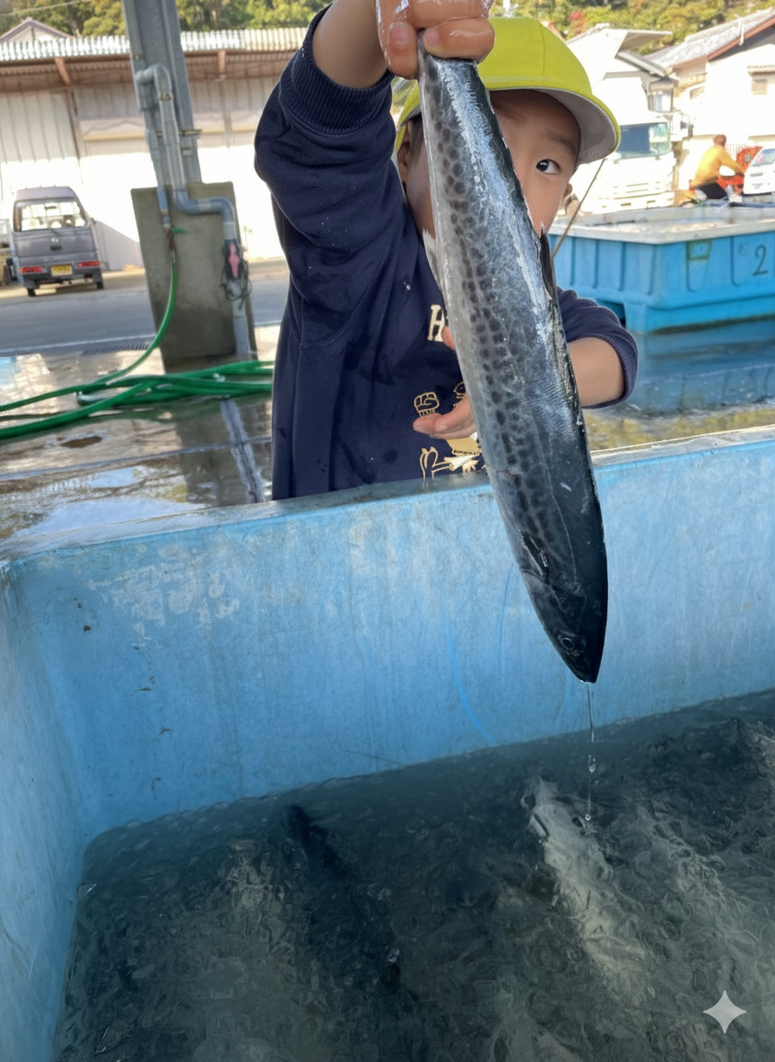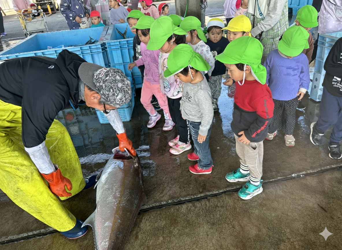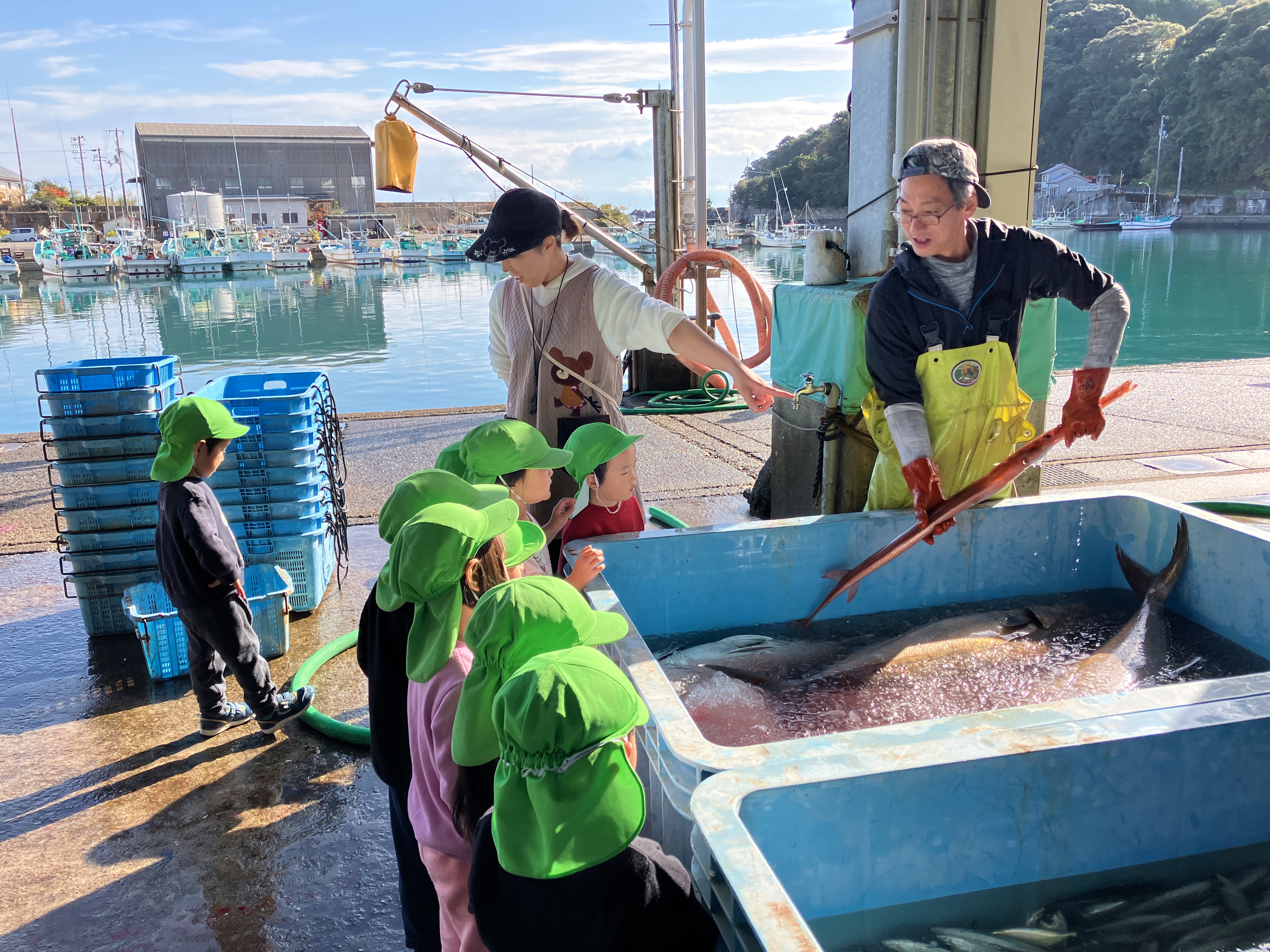 今日は久々に大敷網に魚がたくさん入ったというので、見学に行きました。(焼き芋パーティと同じ日です)サバやアジ、イカなど様々な魚を見せていただき、触らせていただきました。漁協のお兄さんが間近で見せてくれた24キロを超えるカンパチや、細長いヤガラに子どもたちは興味深々で、「のどぐろはおらんの?のどぐろ」「いかおいしそう」などの声が上がっていました。