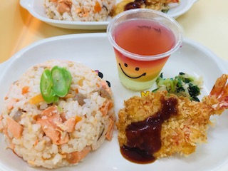 11月の誕生会の給食は『石狩ご飯、エビフライ、ほうれん草のツナ和え、紅葉ゼリー』でした。保育園のエビフライは鯵の開きのように、身体を開いて揚げるので、全体的にサクサクに仕上がっています。紅葉ゼリーは、夏には青々としていた紅葉が赤く色づいていることを表現して、緑、黄色、オレンジ、赤の4層構造にしてみました。色の名前を言ったり、層を数えたり、紅葉について保育士に聞いたりと、子どもたちの関心も高かったです。