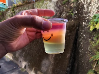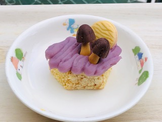 そして誕生会のおやつは『紫イモのモンブラン』です。紫イモを蒸しあげて裏ごしをして、生クリーム、牛乳で整えて、紫のお山(モンブラン)を作りました。キノコたちが生えています。紅葉ゼリーは色の変化を生かして、またモンブランは自然の紫色を生かして、五感で楽しめるメニューとなりました。(二葉保育園だけの食育メニュー)
