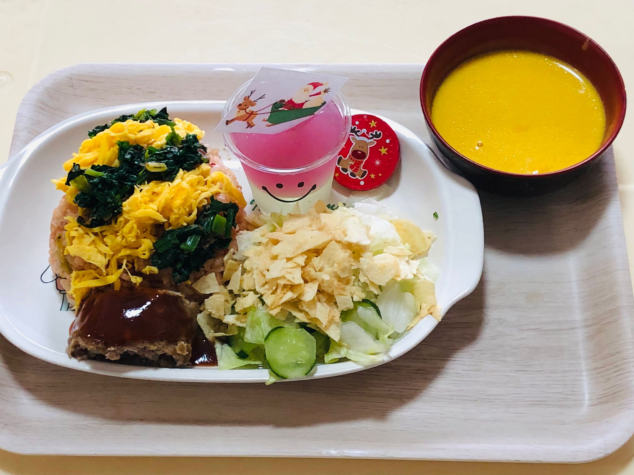 12月の誕生会は少しクリスマスの風味のあるランチとなっています。フレッシュトマトで作ったトマトソースで作ったトマトライスに、いまが旬の「おかかで和えた」ほうれん草と錦糸卵がたっぷり、副食はお野菜もたっぷり入ったミートローフ、サラダはドレッシングの代わりにポテチが乗ったポテチサラダ、そして、子どもたちに大人気、旬のカボチャを使った完全手作りのカボチャスープ、そして二葉保育園と言えば『カラフルゼリー』今回はツリーの緑、雪のホワイト、サンタさんの赤の三層にしたそうです。おまけにコインのチョコが1枚ついてました。