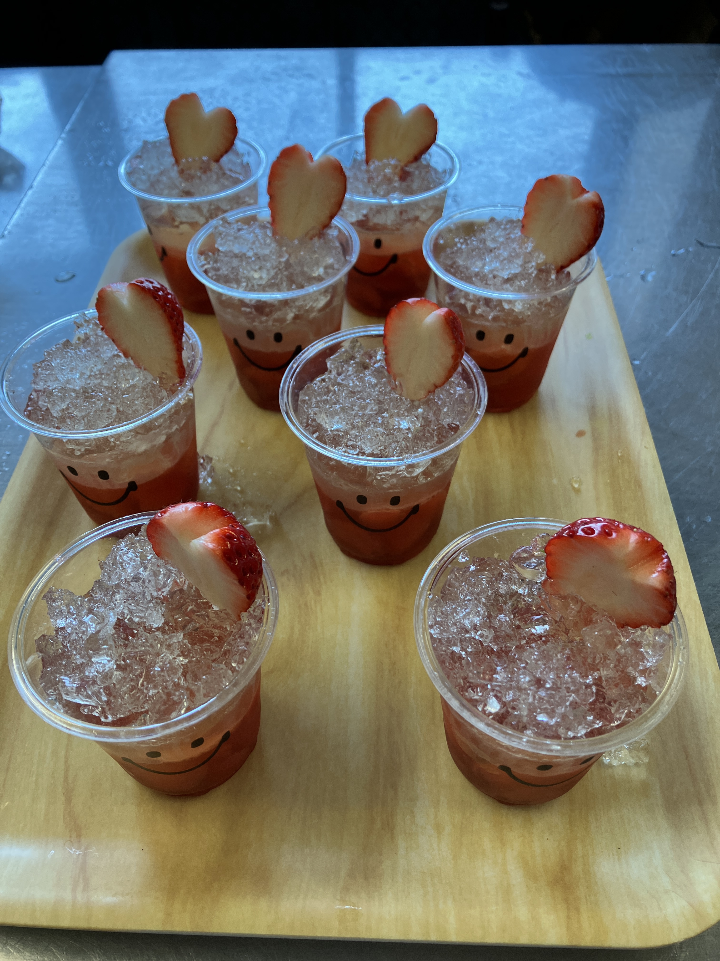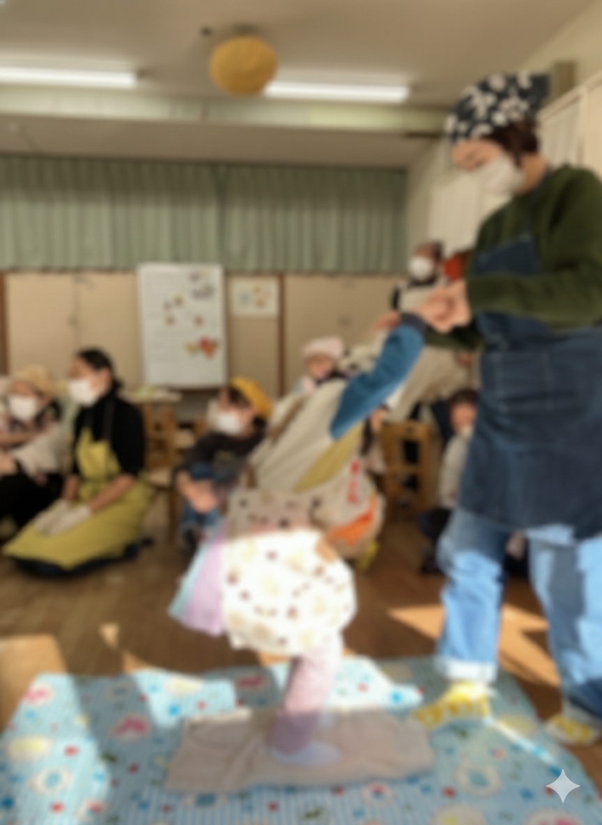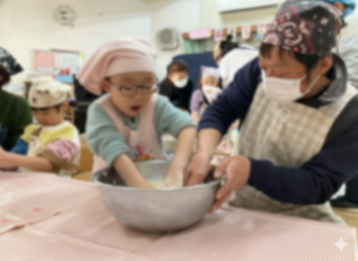 今日はさくらぐみ(4歳児)の親子クッキング、手打ちうどんとフルーツサラダを作りました。昨日はピア海部にお買い物に行って、今日の材料を揃え、1日寝かすためにみんなでうどんの生地を作っていました。今日はお父さんお母さんとのクッキング、生地をもう一度最初から作りました。さくらさんは昨日一度体験してるので、「こうやって混ぜるんよ」「もっと強く踏まなあかん」とお父さん、お母さんに教えていました。「こねて」「踏んで」「切って」「ゆでた」つるつるシコシコのうどん、二葉の手作り出汁も大人気で、みんなぺろりと食べました。デザートは子どもたちのリクエストイチゴゼリーのクラッシュゼリー乗せ、スライス苺がたっぷり入ったイチゴゼリーにサイダーを閉じ込めたクラッシュゼリーを載せて苺を飾りました。今日作った生地はおみやげに持って帰りました。あまった出汁も持って帰りたいとの希望で全部売り切れでした。楽しい時間をありがとうございました。