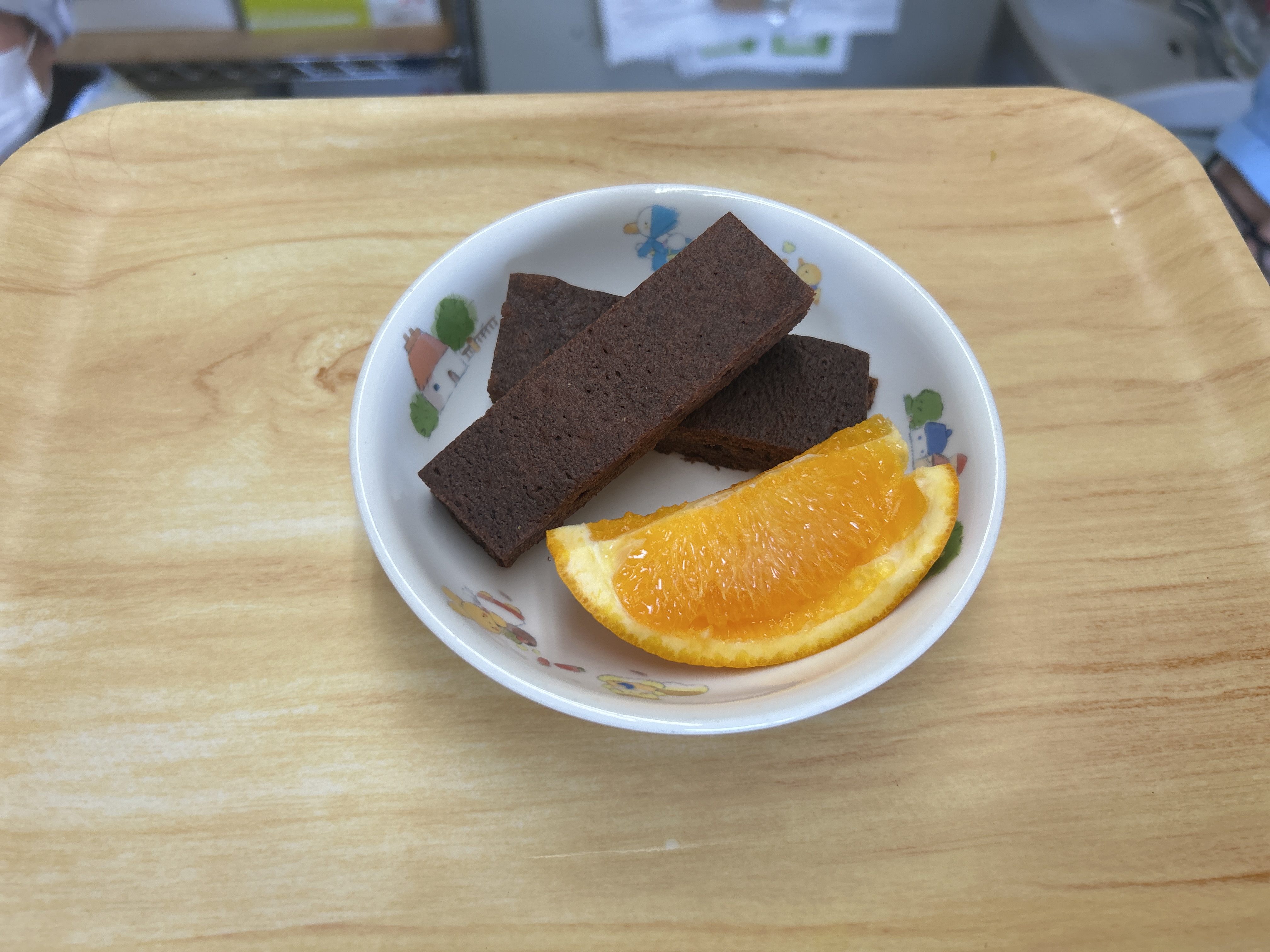 おやつはガトーショコラとオレンジでした。ガトーショコラは超大人気であっと言う間に売り切れてしまいました。たくさ食べて、いっぱい遊んで、ぐんぐん大きくなってね!