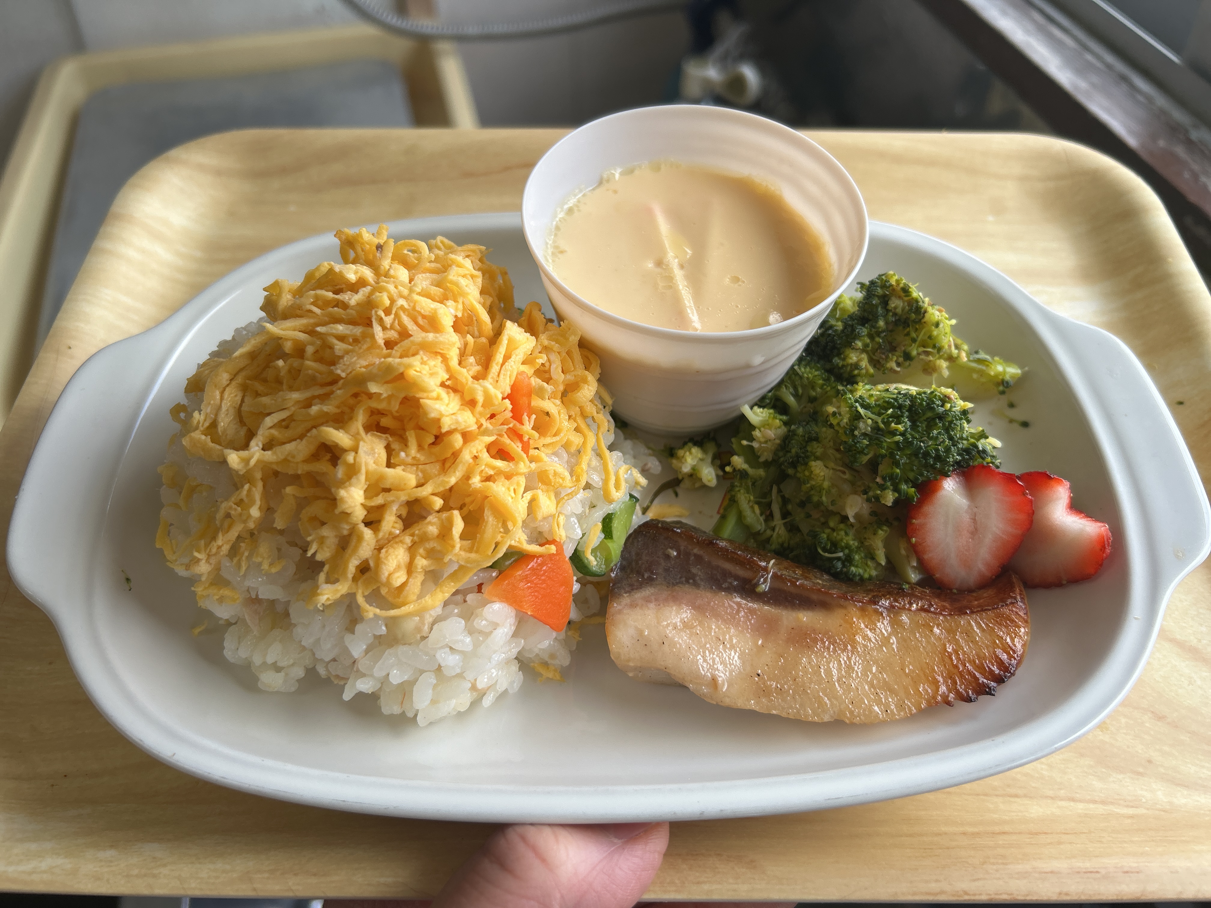 1月の誕生会の給食はサラダ寿司、ブリの照り焼き、茶わん蒸し、ブロッコリーの塩昆布和え、いちごです。サラダ寿司はシーチキンとサイコロチーズ、にんじん、きゅうりがかくれんぼしています。ブリは地物があればよかったのですが、愛媛産のブリを美味しそうな照りがでるまで照り焼きにしました。茶わん蒸しは鶏肉、シイタケ、かまぼこが中に隠れています。ブリの照り焼きと茶わん蒸しはおかわりの行列ができていました。「茶わん蒸しに砂糖入れたらプリンになるんかなぁ」という声がおかわりの列から聞こえてきました。